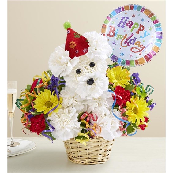 Turning another year older is a lot more fun with our signature birthday a-DOG-able! This party pooch arrives wearing a festive hat, surrounded by a mix of colorful blooms to liven up their celebration. A great gift idea for any age, he’s here to deliver your best wishes in original style. One-sided 3D arrangement with white carnations, red mini carnations, yellow daisy poms, Athos poms and purple statice; accented with assorted greenery Arranged in the shape of a dog, complete with eyes, nose, plush party hat and colorful curled ribbon Artistically designed in our lined wicker pet basket; measures 3.5"H x 5"D Arrangement measures approximately 11"H x 11"W Our florists hand-design each arrangement, so colors and varieties may vary Add to their gift: “Happy Birthday” Mylar balloon; design on balloon will vary due to local availability; measures 18"